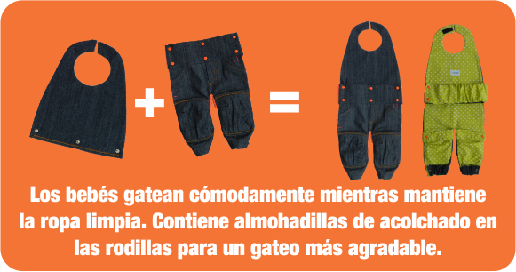 Es un accesorio diseñado para los bebés en su etapa de gateo, el cual se coloca por encima de su ropita protegiéndosela de la parte delantera de la fricción que esta actividad produce al momento de deslizarse por el suelo además de brindarle confort en sus rodillas, ya que tiene almohadillas internas en esta zona brindándole soporte extra.